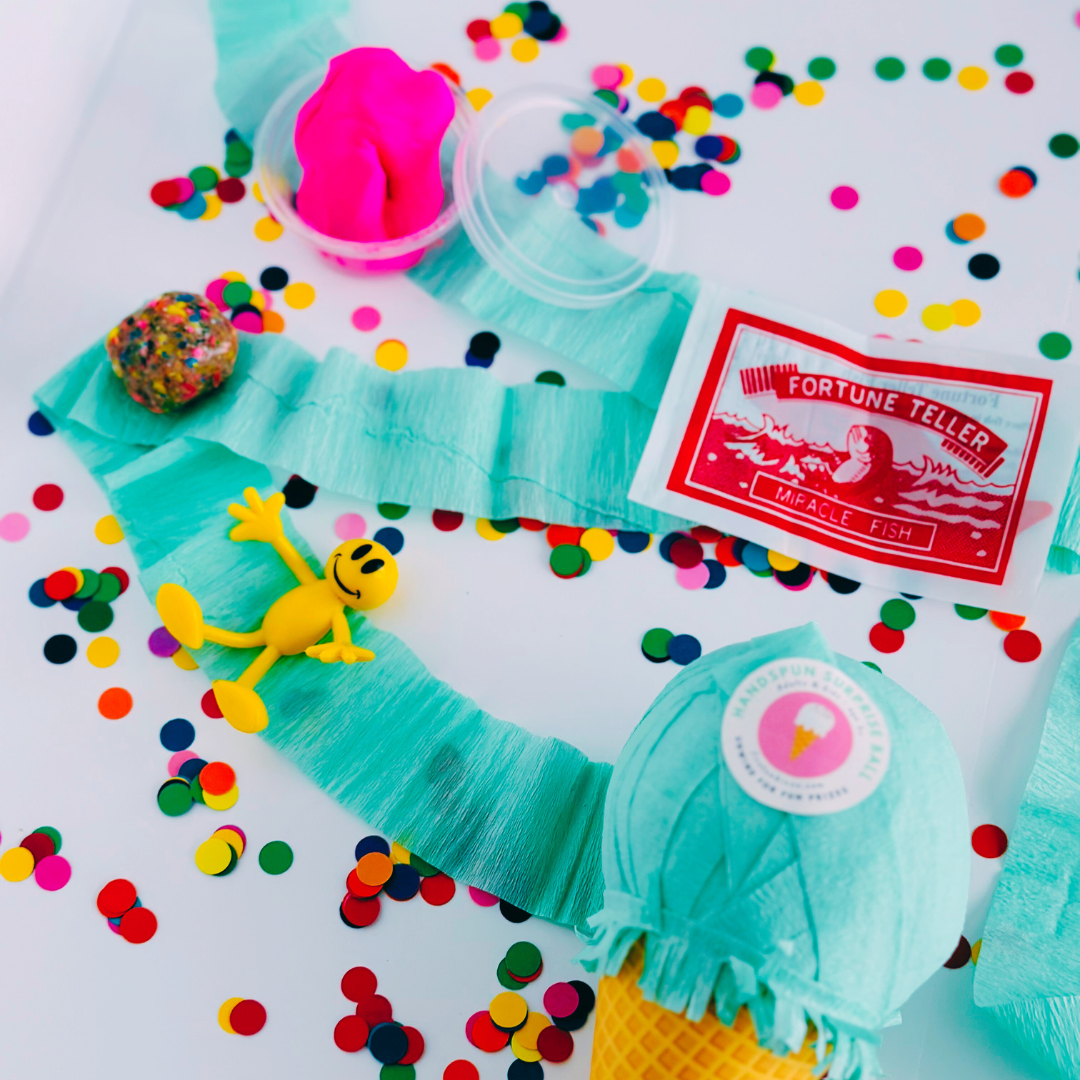 A surprise ball (or cone!) is a tightly wound ball of crepe paper ribbons that, when unraveled, reveals tiny gifts, toys, and keepsakes. Originally a popular toy in the 1950s. Unwinding a Surprise Ball is memorable fun for both adults and kids.